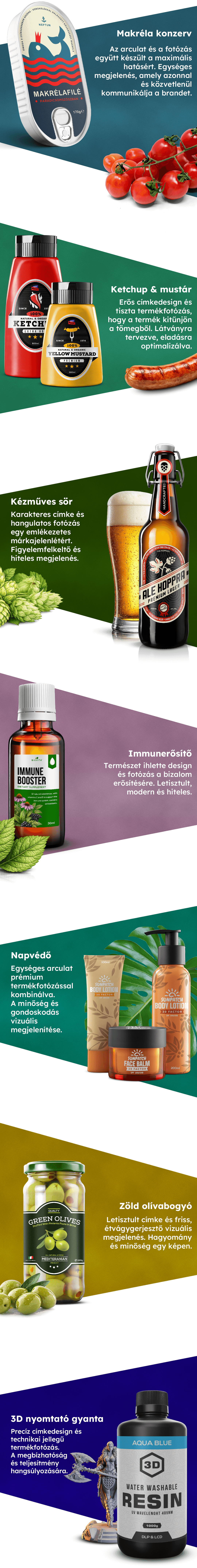 Stúdió környezetben készített fotóink célja a termék részleteinek és karakterének pontos bemutatása, míg a címke és csomagolás tervezés a márka vizuális identitását erősíti. A bemutatott projektek egy része kizárólag csomagolástervezési koncepció, más része fotózási munka. A két terület itt demonstrációs céllal együtt jelenik meg, de minden esetben önálló szolgáltatásként is elérhető.