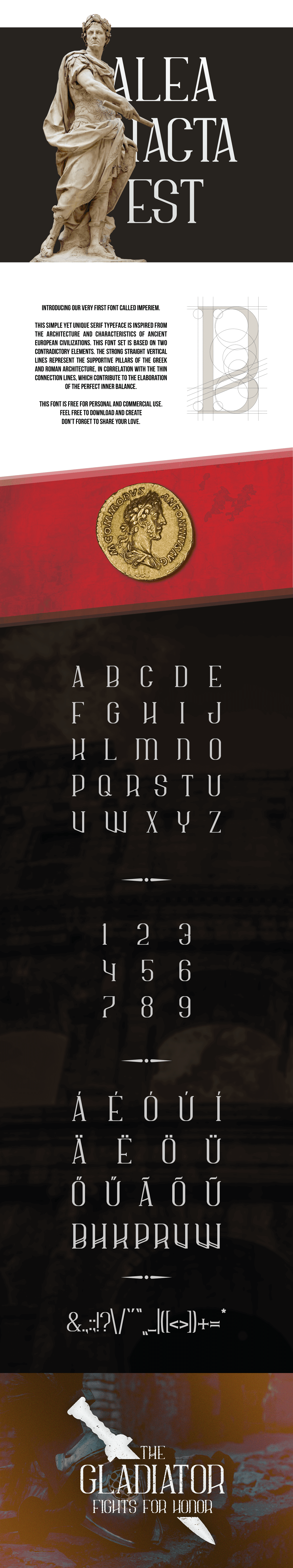 Az Imperiem betűtípus a klasszikus serif tipográfia hagyományaira épül, hangsúlyos formákkal és kiegyensúlyozott arányokkal.